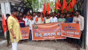 इस मौके पर आयोजित सभा को संबोधित करते हुए मंच के जिला अध्यक्ष अवधेश नारायण शुक्ला ने कहा कि जेल में तैनात एसडीएम राहुल भट्ट पूर्व में सिराथू में भी उप जिलाधिकारी के तौर पर रहे हैं। तब इन्होंने वहां पर किले में मुसलमानों की मजारों का निर्माण कराया जो की पूरी तरह अवैध था यही नहीं कई हिंदुओं की जमीन पर भी इन्होंने कब्जा कराया। अब चायल तहसील में भी उन्होंने वही काम शुरू कर दिया है उन्होंने पेरवा तथा मूरतगंज में दलितों के जमीनों पर वर्ग विशेष के साथ मिलीभगत कर उनकी जमीनों में अवैध कब्जा करवा दिया। इसके साथ हिंदू जागरण मंच के लोगों ने उप जिला अधिकारी शायद राहुल भट्ट के अवैध संपत्तियों की भी जांच कराए जाने की मांग किया। इस मौके पर प्रमुख रूप से रजत पांडे, शिखर मिश्रा, चेतन दुबे, रमेश कुमार, धर्मेंद्र कुमार, पिंटू तिवारी, प्रकाश दुबे, जेपी सरोज, अशोक कुमार, सुशील कुमार, धीरज, राजू, अवधेश, सोनू भारतीय, आशीष, आकाश, सर्वेश कुमार, सूबेदार, घनश्याम, रामबाबू मौर्या, राम सिंह सोनकर, ओम प्रकाश, अतुल, धीरेंद्र, अनिल सहित सैकड़ों की संख्या में लोग मौजूद रहे।