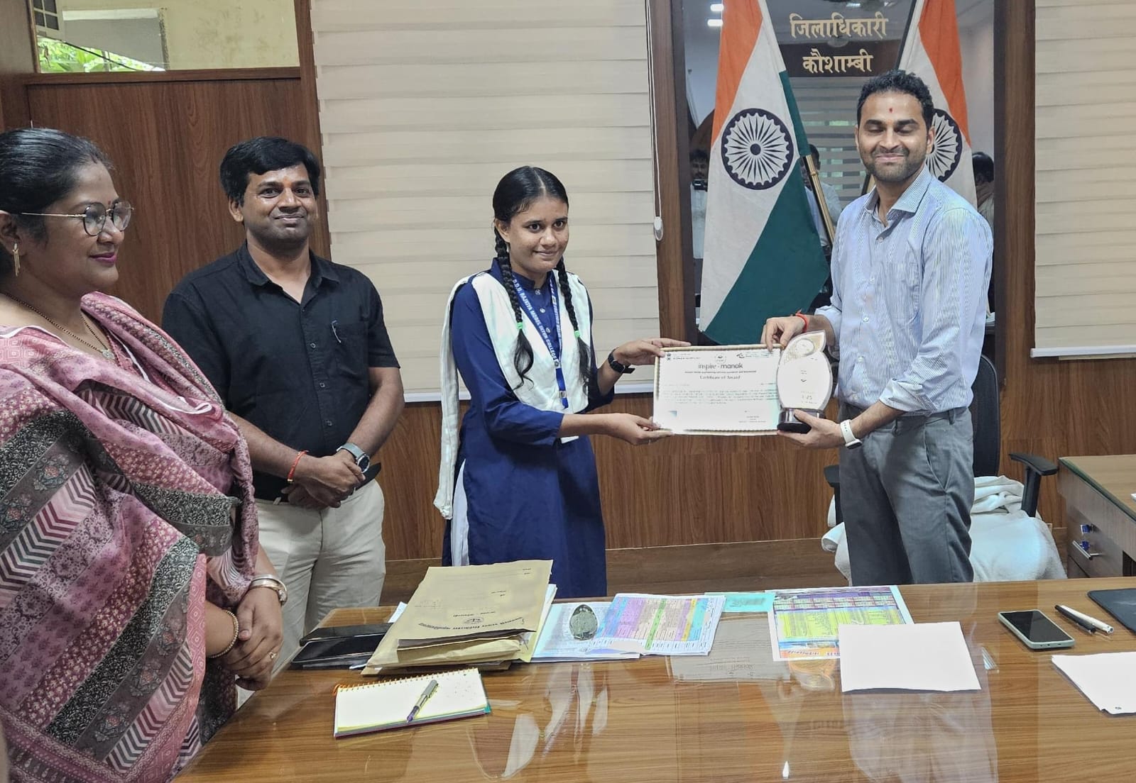 जिलाधिकारी मधुसूदन हुल्गी ने आज कार्यालय कक्ष में पं. दीनदयाल उपाध्याय राजकीय मॉडल इण्टर कॉलेज, केसारी की कक्षा-10 की छात्राओं मोहिनी व शाजिया खान को इंस्पायर अवार्ड 2024-25 के अंतर्गत वैज्ञानिक नवाचार एवं विचार में उत्कृष्ट कार्य के लिए अवार्ड एवं प्रमाण-पत्र प्रदान कर सम्मानित किया।