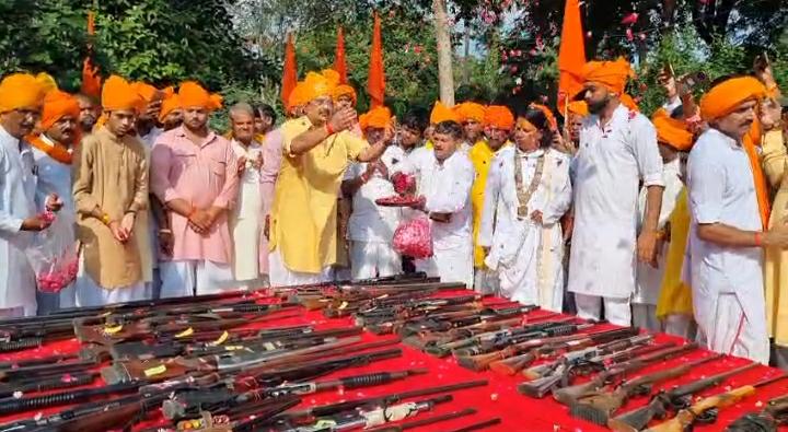 पुरोहित द्वारा मंत्रोच्चार के बीच शस्त्र पूजन किया गया। इस मौके पर बड़ी संख्या में समर्थकों का जमावड़ा रहा।