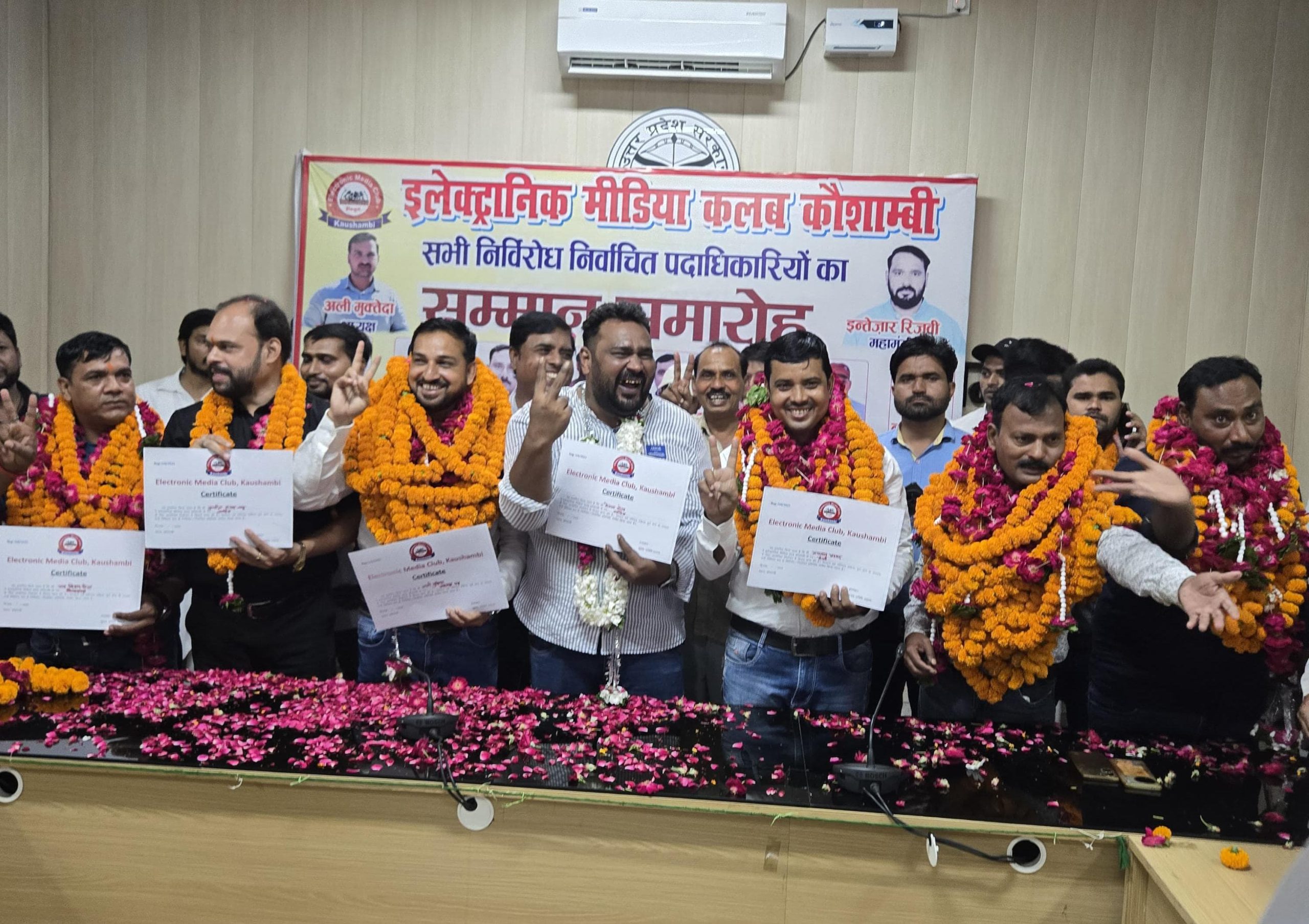 कौशांबी-इलेक्ट्रॉनिक मीडिया क्लब, कौशांबी के चुनाव में इस बार उत्साह और सौहार्द का माहौल देखने को मिला। नामांकन प्रक्रिया में कुल आठ पदों पर उम्मीदवारों ने अपना नामांकन दाखिल किया। विशेष बात यह रही कि सभी पदों पर एक ही नामांकन होने के कारण सभी पदाधिकारी निर्विरोध निर्वाचित घोषित कर दिए गए। अध्यक्ष अली मुक्तेदा, उपाध्यक्ष अमर नाथ झा, महामंत्री इंतेजार रिजवी, संगठन मंत्री शनिराज वर्मा, कोषाध्यक्ष राम किशन पटेल, मंत्री अयमान अहमद, आय-व्यय निरीक्षक नवनीत कुमार, सचिव सुनील कुमार साहू, मेराज शेख और खादिम रिजवी निर्विरोध निर्वाचित हुए है। संगठन के संस्थापक धारा सिंह ने निर्विरोध चुनाव को पत्रकारों की एकजुटता का प्रतीक बताया। उन्होंने कहा कि इलेक्ट्रॉनिक मीडिया क्लब का उद्देश्य पत्रकारों के अधिकारों की रक्षा और समाजहित में निष्पक्ष पत्रकारिता करना है। वहीं संरक्षक प्रसिद्ध मिश्रा ने उम्मीद जताई कि नव-निर्वाचित टीम संगठन को नई दिशा और मजबूती देगी। अध्यक्ष अली मुक्तेद ने कहा कि उन्हें जो जिम्मेदारी सौंपी गई है, उसे पूरी निष्ठा और पारदर्शिता के साथ निभाएँगे। उपाध्यक्ष अमरनाथ झा ने संगठन को मजबूत बनाने का संकल्प लिया। महामंत्री इंतेजार रिजवी ने कहा कि क्लब की गतिविधियों को और रचनात्मक बनाया जाएगा। संगठन मंत्री शनिराज वर्मा ने संगठन विस्तार और नए पत्रकारों को जोड़ने पर जोर दिया। कोषाध्यक्ष राम किशन पटेल ने वित्तीय पारदर्शिता को प्राथमिकता देने की बात कही। मंत्री अयमान अहमद ने सभी प्रस्तावों को लागू कराने की जिम्मेदारी निभाने का आश्वासन दिया। आय-व्यय निरीक्षक नवनीत कुमार ने आर्थिक अनुशासन बनाए रखने का वादा किया। सचिव सुनील कुमार साहू ने कहा कि संगठन की गतिविधियों को व्यवस्थित और प्रभावी ढंग से संचालित करेंगे। सचिव मेराज शेख और खादिम रिजवी ने संयुक्त रूप से कहा कि वे टीम वर्क को आगे बढ़ाएँगे। निर्वाचन परिणाम घोषित होने के बाद संगठन के कार्यालय में उत्सव का माहौल देखने को मिला। पदाधिकारियों के स्वागत में सैकड़ो गाड़ियों के काफिले के साथ जिला मुख्यालय मंझनपुर में जुलूस भी निकाला गया। जगह-जगह लोगो ने स्वागत किया। जुलूस को सकुशल सम्पन्न कराने के लिए प्रशासन पूरी तरह से मुस्तैद रहा। सुरक्षा की दृष्टि से जुलूस मार्ग पर जगह-जगह पुलिस बल की तैनाती की गई। जुलूस के आगे पुलिस स्क्वॉड और पीछे दंगा नियंत्रण बल लगाया गया, ताकि किसी भी प्रकार की अराजकता या अव्यवस्था फैलने न पाए। अधिकारी खुद मौके पर मौजूद रहकर हालात पर नजर रखे हुए थे। सुरक्षा व्यवस्था के चलते जुलूस शांति और सौहार्दपूर्ण माहौल में सम्पन्न हुआ। सभी निर्वाचित पदाधिकारियों को फूलमालाओं से स्वागत किया गया। 