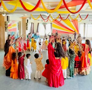 कौशाम्बी- भरवारी स्थित हेलो किड्स शाखा में नवरात्रि के पावन अवसर पर छोटे बच्चों और उनकी माताओं के लिए गरबा–डांडिया नृत्य का भव्य आयोजन किया