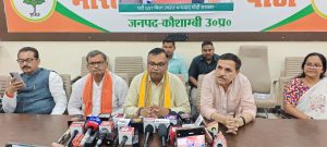 कौशाम्बी- भारतीय जनता पार्टी जिला कार्यालय में जीएसटी उत्सव अभियान के निमित्त आयोजित प्रेस वार्ता को जिला प्रभारी अवधेश चंद्र गुप्ता,जिलाध्यक्ष धर्मराज मौर्य,निवर्तमान सांसद विनोद